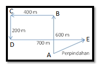 Fitria melakukan perjalanan napak tilas dimulai dari titik A ke titik B 600 m arah utara, ke titik C 400 m arah barat, ke titik D 200 m arah selatan, dan kemudian berakhir di titik E 700 m arah timur. Besar perpindahan yang dialami Fitria adalah ....