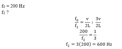 Frekuensi nada dasar yang dihasilkan oleh sebuah dawai adalah 200 Hz. Maka nada atas kedua yang dihasilkan mempunyai frekuensi sebesar .…
