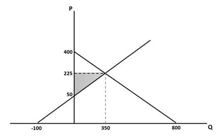 Fungsi permintaan suatu produk dapat diformulasikan sebagai berikut Qd = 800 - 2P sedangkan fungsi penawarannya 2Qs = -200 + 4P Besarnya surplus yang diterima oleh produsen pada saat terjadinya keseimbangan pasar adalah…