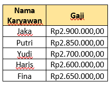 Gaji per minggu 5 karyawan PT. Timbul Perkasa adalah sebagai berikut.