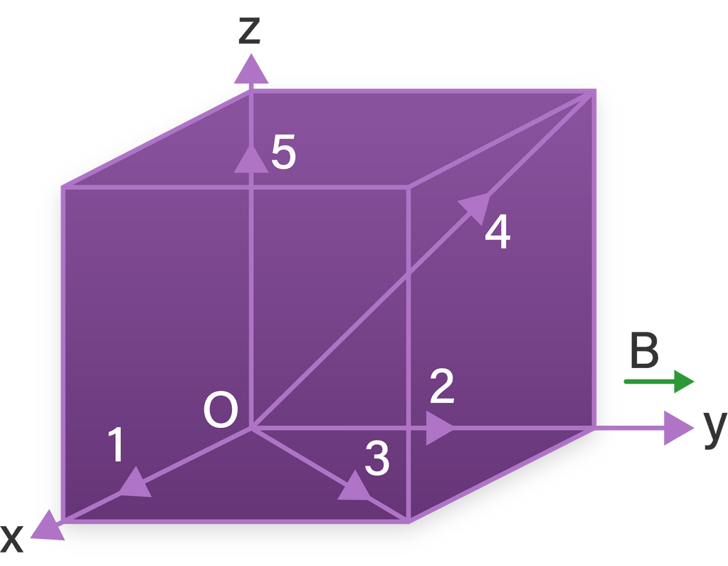 Gambar berikut ini menunjukkan sebuah kubus, di mana sebuah muatan mula-mula berada pada titik asal O. Kubus diberi medan magnet homogen searah sumbu y. Jika muatan bergerak dengan kecepatan v dengan arah sebagaimana ditunjukkan dengan arah panah berlabel 1, 2, 3, 4, dan 5, tunjukkan pada arah dengan label angka nomor berapakah gaya magnetik lenyap.