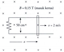 Gambar berikut menunjukkan batang logam yang diletakkan di atas rangkaian. Luas penampang rangkaian tertembus seeara tegak lurus oleh medan magnetik B = 0,15 T. Jika hambatan rangkaian itu 3 ohm, berapa besar gaya yang diperlukan untuk menggerakkan batang dalam arah yang ditunjukkan dengan laju tetap 2 m/s?