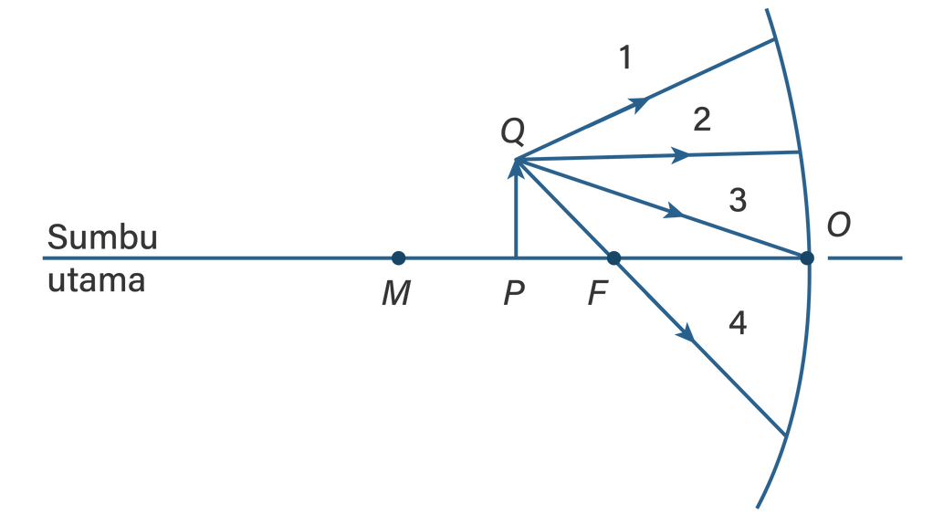 Gambar berikut menunjukkan empat sinar cahaya dari benda PQ yang datang pada cermin lengkung dengan jarak fokus 0,06 m. Titik F adalah fokus utama cermin, titik M adalah pusat kelengkungan cermin, dan titik O terletak pada sumbu utama.