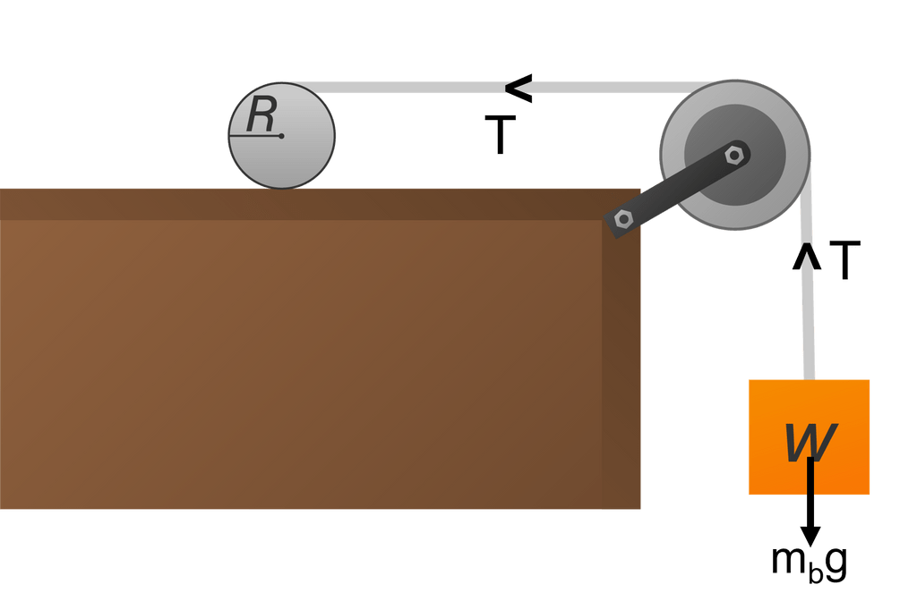 Gambar di bawah menunjukkan sebuah balok (w = 10 N) tergantung pada seutas tali yang dililitkan mengitari sebuah silinder pejal (w = 40 N, R = 0,2 m). Permukaan mendatar tempat silinder bergerak adalah licin (gesekan diabaikan). Katrol juga dianggap licin. Tentukan percepatan balok dan tegangan dalam tali penghubung! (g = 10 m/s2)