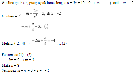 Garis singgung pada kurva di titik (-2, -4) tegak lurus x + 5y + 10 = 0. Nilai m – n adalah….