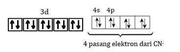ion Cu+ akan menerima 4 pasang elektron bebas dari CN-. Oleh karena itu, Cu+ harus menyiapkan 4 orbital kosong (sebagai ion pusat), untuk menerima 4 pasang elektron bebas dari CN- (sebagai ligan). 4 orbital kosong tersebut dapat diperoleh dari orbital pada kulit terluar, dalam hal ini yaitu kulit ke-4, yang dimulai dari 4s kemudian 4p.