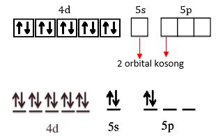 Pada ion kompleks [Ag(NH3)2]+, ion Ag+ menerima 2 pasang elektron bebas dari NH3. Oleh karena itu, Ag+ harus menyiapkan 2 orbital kosong untuk menerima 2 pasang elektron koordinasi dari NH3. Orbital kosong yang digunakan adalah 5s dan 5p.