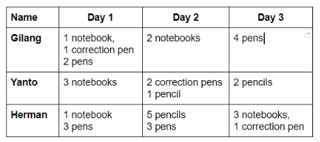 Gilang’s father sells stationery. Gilang and his two brothers, Herman and Yanto help him sell the stuff. They do it joyfully since their service is paid based on the following terms: