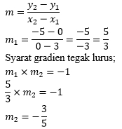 Gradien garis yang tegak lurus dengan garis yang melalui titik (3,0) dan (0,-5) adalah….