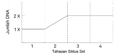 Grafik berikut menunjukkan perubahan jumlah DNA sel biji semangka selama siklus sel! 2X menunjukkan penggandaan jumlah DNA.