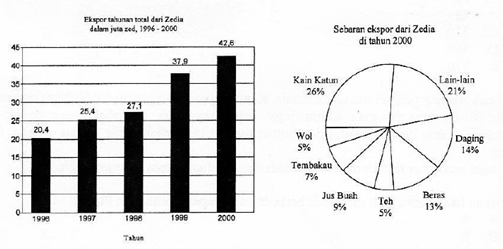 Grafik di bawah ini memberikan informasi tentang ekspor dari Zedia, sebuah negara yang menggunakan satuan mata uang Zed.