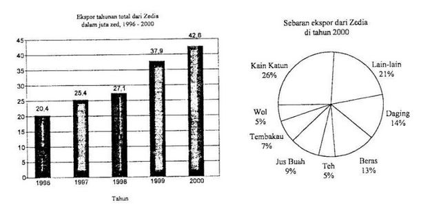 Grafik di bawah ini memberikan informasi tentang ekspor dari Zedia, sebuah negara yang menggunakan satuan mata uang Zed.