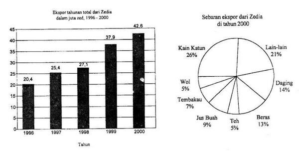 Grafik di bawah ini memberikan informasi tentang ekspor dari Zedia, sebuah negara yang menggunakan satuan mata uang zed.