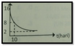 Grafik di samping menunjukan hubungan jumlah zat (N) terhadap waktu (t) pada peluruhan sebuah unsur radioaktif. Waktu yang diperlukan untuk meluruhkan unsur tersebut hingga tersisa 2 mol adalah . . .