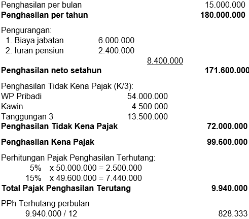 Habibi seorang manajer perusahaan manufaktur di Indonesia. Habibi menerima pendapatan sebesar Rp. 15.000.000,00 per bulan. Dalam satu tahun ia membayar iuran pensiun sebesar Rp. 2.400.000,00. Biaya jabatan per tahun yang ditetapkan perusahaan Habibi sebesar Rp. 6.000.000,00. Habibi telah menikah dan memiliki 3 orang anak. Isteri Habibi tidak bekerja. Berapakan pajak penghasilan yang harus dibayar Habibi setiap bulan?