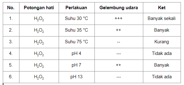 Hasil percobaan enzim katalase menggunakan potongan hati dan H2O2 adalah sebagai berikut: