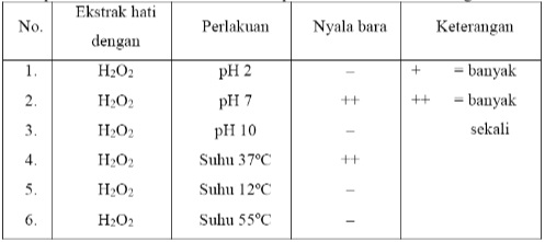 Hasil percobaan enzim katalase terhadap ekstrak hati adalah sebagai berikut: