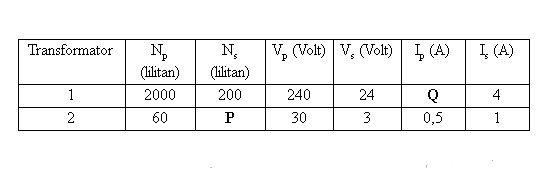 Jika efisiensi kedua transformator sama sebesar 20%, maka nilai P dan Q adalah ….