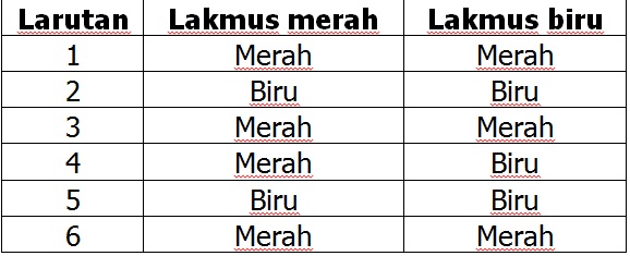 Hasil percobaan warna kertas lakmus dalam larutan sebagai berikut.