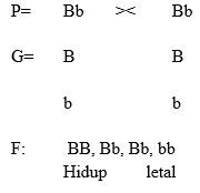 Hasil persilangan antara genotip Bb dengan Bb dimana gen b bersifat letal, keturunan yang diharapkan hidup adalah…
