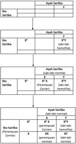 Hemofilia merupakan kelainan genetik yang menyebabkan darah penderitanya sulit membeku. Kelainan ini terpaut kromosom X. Perempuan dapat menjadi carrier atau pembawa sifat hemofilia pada salah satu kromosom Xnya, sementara jika kedua kromosom Xnya mengandung gen hemofilia maka individu tersebut bersifat letal (mengalami kematian) saat dilahirkan. Sartika memiliki adik laki-laki yang menderita hemofilia, sementara ia sendiri merupakan carrier hemofilia. Berdasarkan data tersebut, maka kemungkinan orang tua Sartika menghasilkan keturunan normal (tidak mengandung gen hemofilia) adalah sebesar…