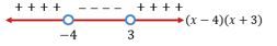 Karena tanda pertidaksamaannya adalah > , maka pilih daerah yang bernilai positif, yaitu x < -4 atau x > 3 .