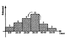 Histogram berikut menunjukkan data umur penghuni rumah kontrakan milik Pak Achmad. Modus data tersebut adalah ....