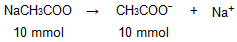 Dari persamaan reaksi di atas, dapat diketahui bahwa koefisien NaCH3COO sama dengan koefisien CH3COO−, sehingga mol NaCH3COO sama dengan mol CH3COO−, yaitu 10 mmol.