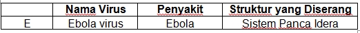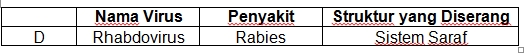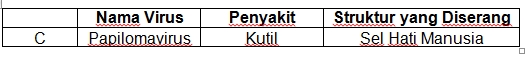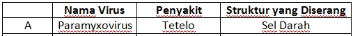 Hubungan yang tepat antara virus, penyakit dan struktur yang diserangnya adalah…
