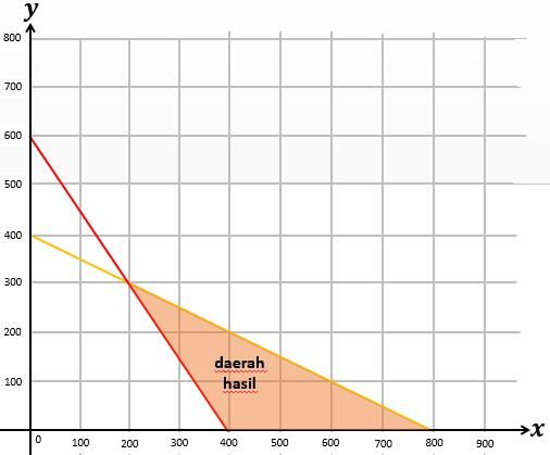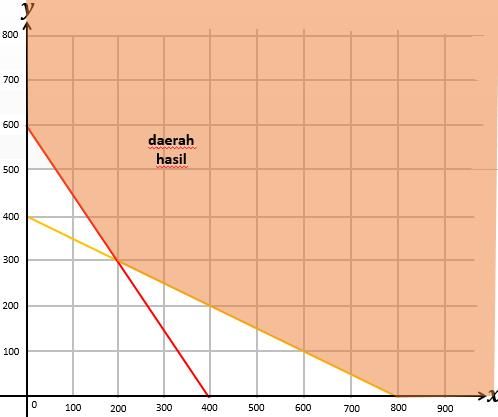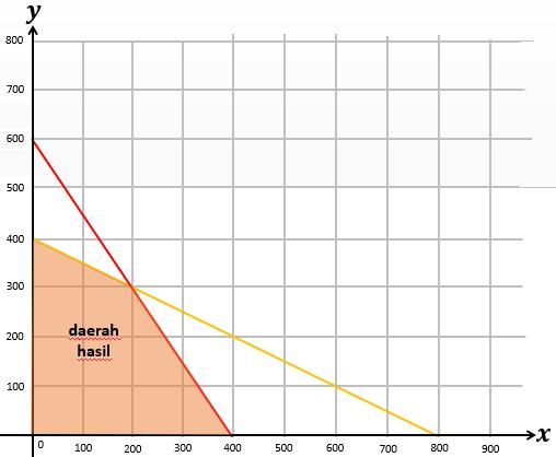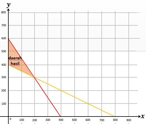 Ibu akan membuat dua jenis kue, kue tart dan kue lapis. Untuk membuat 1 kue tart, dibutuhkan 10 gram tepung dan 15 gram gula. Untuk membuat 1 kue lapis, dibutuhkan 20 gram tepung dan 10 gram gula. Ibu memiliki stok tepung sebanyak 8 kg dan gula sebanyak 6 kg. Daerah penyelesaian dari sistem pertidaksamaan linear dua variabel yang menggambarkan kondisi di atas adalah ….