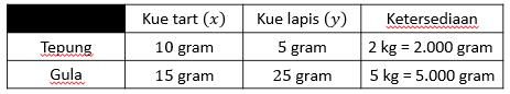 Ibu akan membuat dua jenis kue, kue tart dan kue lapis. Untuk membuat 1 kue tart, dibutuhkan 10 gram tepung dan 15 gram gula. Untuk membuat 1 kue lapis, dibutuhkan 5 gram tepung dan 25 gram gula. Ibu memiliki stok tepung sebanyak 2 kg dan gula sebanyak 5 kg. Sistem pertidaksamaan linear dua variabel yang menggambarkan kondisi di atas adalah ….