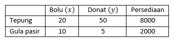 Ibu ingin membuat dua jenis kue, yaitu bolu dan donat. Di dapur tersedia 8 kg tepung dan 2 kg gula pasir. Untuk membuat 1 buah bolu dibutuhkan 20 gram tepung dan 10 gram gula pasir, sedangkan untuk membuat 1 buah donat dibutuhkan 50 gram tepung dan 5 gram gula pasir. Jika bolu dijual Rp 2.000 perbuah dan donat dijual Rp 3.000 perbuah, maka pendapatan maksimum yang diperoleh ibu adalah...