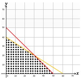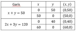 Dapat dilihat pada daerah penyelesaian di atas, terdapat 4 titik pojok yakni ( 0,0), (50,0) , (0,40) dan satu titik potong antara garis