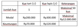 Kemudian, banyak kue tart ( x) dan banyak kue lapis ( y) tidak mungkin negatif dan tidak mungkin berbentuk pecahan sehingga kita peroleh