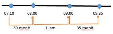 Ibu pergi ke pasar pada pukul 07.10 dan kembali lagi ke rumah pada pukul 09.35. Jika diubah dalam satuan menit, Ibu berada di pasar selama....