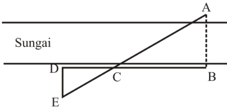 Tiga orang anggota Pramuka berusaha untuk menaksir jubah sungai (AB). hasil pengukuran oleh anggota berdiri di B dan C temyata mereka berjarak 10 meter, sedangkan yang berdiri di E mengukur jarak dari D ke E adalah 4 meter. Karena kesulitan mengukur, mereka bertiga sepakat memperkirakan jarak dari C ke D setengahnya dan jarak B ke C.