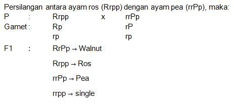 Interaksi 2 gen terjadi pada jengger ayam, interaksi gen R - P (walnut), gen R - p (ros), gen r - P (pea), dan gen r - p (single). Ayam ros (Rrpp) yang disilangkan dengan ayam pea (rrPp) menghasilkan fenotip ....