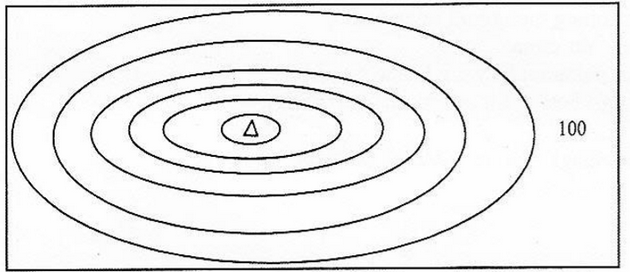 Interval peta kontur seperti gambar 100 meter maka titik puncak A berada di ketinggian ….