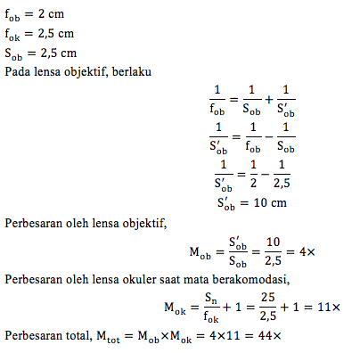 Jarak fokus lensa objektif sebuah mikroskop 2 cm dan okulernya 2,5 cm. Sebuah objek diletakkan sejauh 2,5 cm di depan lensa objektif. Apabila mikroskop digunakan dengan mata berakomodasi maksimum maka perbesaran mikroskop adalah .... (Sn = 25 cm)