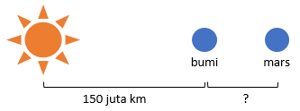 Jarak rata-rata bumi ke matahari adalah 150 juta km. Satu kali revolusi planet Mars mengelilingi matahari adalah 1,87 tahun. Jika Bumi, Mars, dan matahari berada dalam satu garis, perbedaan jarak Bumi dan Mars adalah ….