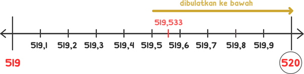 Oleh karena itu, bilangan 519,533 dibulatkan ke atas atau ke bilangan bulat setelahnya, yakni 520.