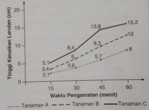 Jihan ingin mengamati pengaruh daya kapilaritas batang terhadap pengangkutan air pada tanaman pacar air. Jihan menggunakan tiga tanaman pacar air dengan ukuran diameter batang yang berbeda, tetapi jumlah daunnya sama. Diameter batang tanaman A sebesar 0,86 cm, diameter batang tanaman B sebesar 1,70 cm, dan diameter batang tanaman C sebesar 2,10 cm. Ketiga tanaman tersebut kemudian dimasukkan ke dalam larutan eosin dan diamati kenaikan air pada batang tanaman tersebut setiap 15 menit selama satu jam. Hasil pengamatan yang diperoleh sebagai berikut.
