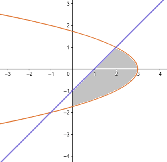 Jika daerah yang dibatasi oleh kurva dan garis x - y = 1 pada daerah x positif diputar mengelilingi sumbu y, maka volume benda putar yang terbentuk adalah...
