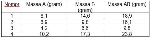 Jadi didapatkan perbandingan massa A dan massa B yaitu 6,9 gram : 9,2 gram atau 3 : 4.