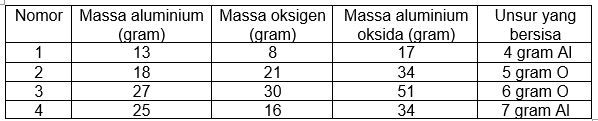 Sekarang kita lihat data pertama, ketika 13 gram aluminium direaksikan dengan 8 gram oksigen, maka akan menghasilkan 17 gram aluminium oksida dan sisa 4 gram aluminium. Artinya aluminium yang bereaksi hanya 9 gram dengan 8 gram oksigen menghasilkan 17 gram aluminium oksida. Sehingga perbandingan massa aluminium dan oksigen adalah 9 : 8.