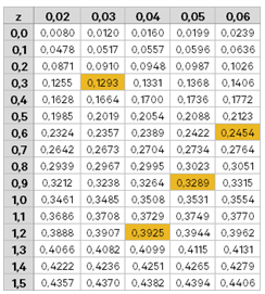 begin mathsize 14px style P left parenthesis 0 less than Z less than 0 comma 33 right parenthesis equals 0 comma 1293 P left parenthesis 0 less than Z less than 0 comma 66 right parenthesis equals 0 comma 2454 P left parenthesis 0 less than Z less than 0 comma 95 right parenthesis equals 0 comma 3289 P left parenthesis 0 less than Z less than 1 comma 24 right parenthesis equals 0 comma 3925 end style