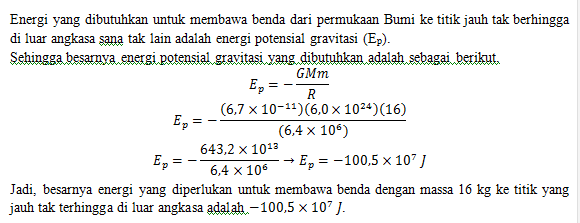 Jika massa Bumi adalah 6,0 x 1024 kg dan jari-jari Bumi adalah 6400 km maka besar energi yang dibutuhkan untuk membawa benda dengan massa 16 kg dari permukaan Bumi ke titik yang jauh tak terhingga di luar angkasa adalah (G = 6,7 x 10-11 Nm2/kg2) ….