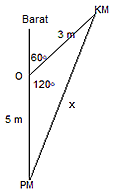 Jika saya mau ke kamar mandi dari pintu masuk harus berjalan kearah barat sejauh 5 m lalu ke arah 60o dari barat sejauh 3 m. Jarak pintu masuk rumah ke kamar mandi jika ditarik garis lurus adalah ….