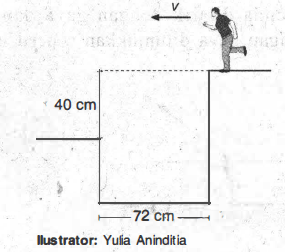 Jika percepatan gravitasi sebesar dan Jono memiliki massa 60 kg, besar energi kinetik setelah melompati parit sebesar...