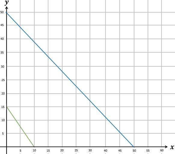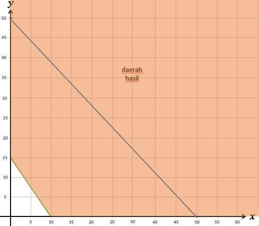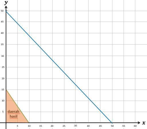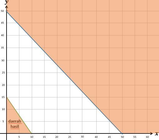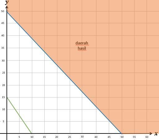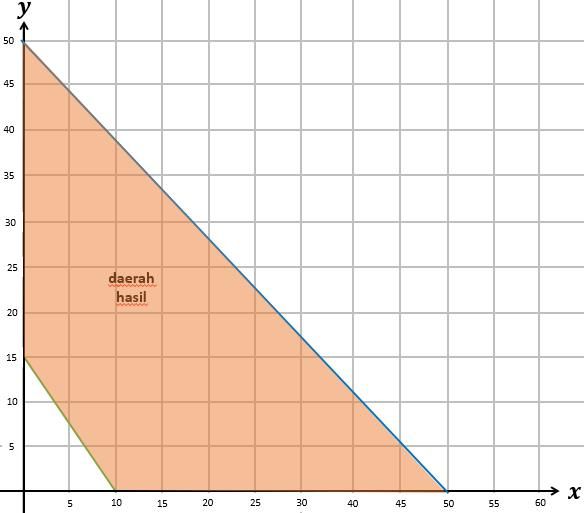 Jumlah dua bilangan positif tak lebih dari 50 dan tiga kali bilangan pertama ditambah dua kali bilangan kedua tak kurang dari 30. Daerah penyelesaian dari sistem pertidaksamaan di atas adalah ….